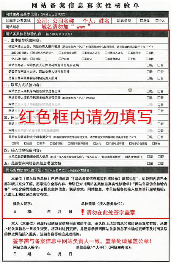 6、信息安全核验单,企业需要法人在网站负责人之处签字和加盖公章即可,参照样板